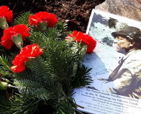 Die Naturfreunde halten die Erinnerung an Valentin Traudt wach und besuchen in regelmäßigen Abständen seine Grabstätte in Rauschenberg. Zu seinem 70. Todestag am 15. März 2020 legten sie sieben rote Nelken auf seinem Grab nieder.