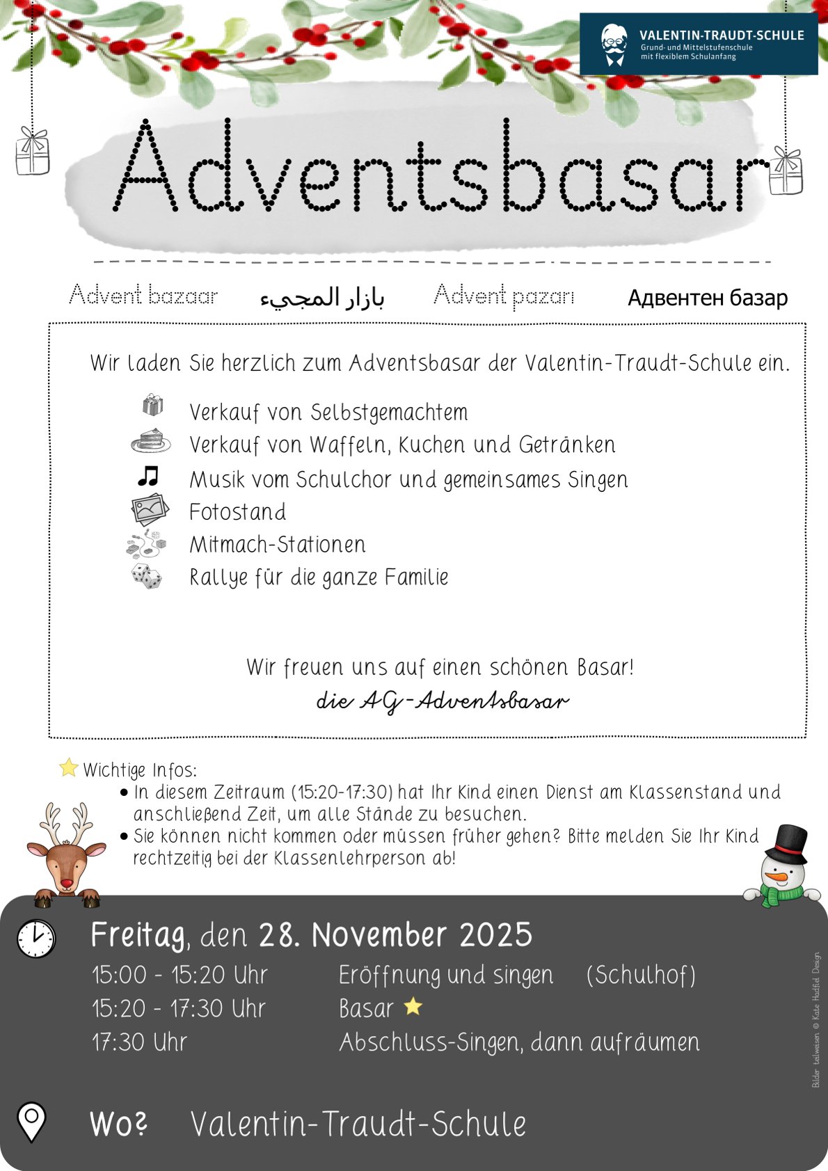 Die Einnahmen im Rahmen des Adventsbasars kommen dem Förderverein der Valentin-Traudt-Schule zugute. Wir freuen uns über zahlreiche Besuchende.