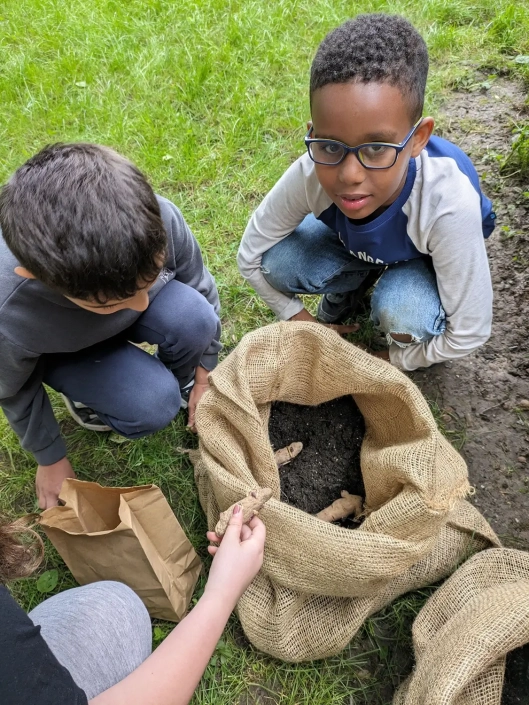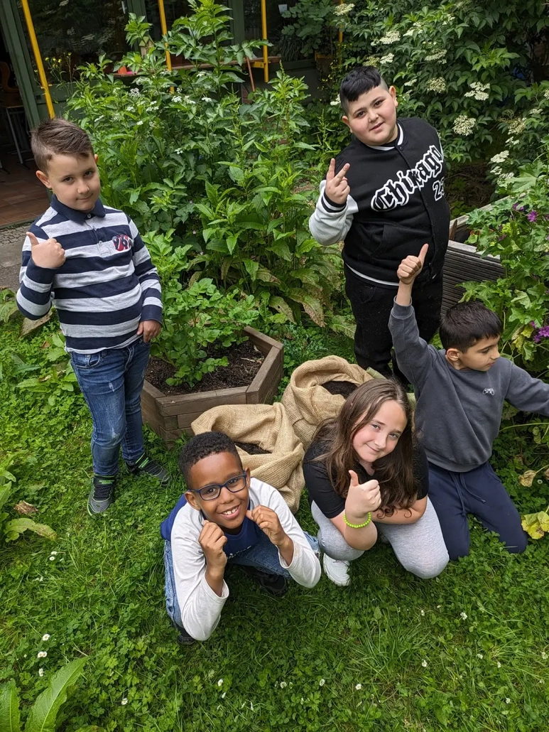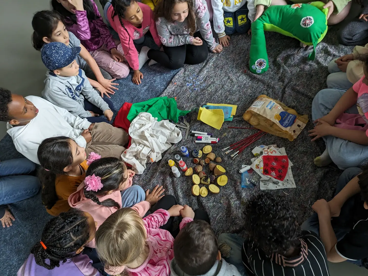 Dieser Satz sorgte bei den Kindern der Katzen-Klasse für große Augen. Am Mittwoch, dem 29. Mai 2024, durfte die Flex-Klasse die Ausstellung „Caring in times of continuous crisis – Part II“ (frei übersetzt: Pflege in Zeiten andauernder Krisen) in den Räumen des Kasseler Kunstvereins besuchen. In der Ausstellung geht es um die Klimasituation und unser Ökosystem als lebendiger Organismus, der Pflege und Fürsorge benötigt. Zuerst betrachteten die Kinder ein Kunstwerk der brasilianischen Künstlerin Luïza Luz und sammelten gemeinsam Ideen, wie man sich um die Erde kümmern kann, damit es ihr besser geht (z.B. durch Mülltrennung und -vermeidung). Anschließend lernten die Kinder eher unbekannte Kartoffelsorten wie das „Bamberger Hörnchen“, die „Adretta“ und die „Laura“ in der Installation The Order of Potatoes der Künstlerin Åsa Sonjasdotter kennen. Diese Kartoffelsorten werden in der EU nur noch eingeschränkt angebaut und verkauft. Beim gemeinsamen Kartoffeldrucken konnten alle Kinder selbst zu kleinen Künstler:innen werden und sich kreativ austoben. Am Ende des spannenden Tages durfte jede:r eine Tüte mit Mutterknollen zum Anpflanzen mit nach Hause nehmen. Einige Knollen wurden am Montag von der Forscher:innen-AG auch im Schulgarten eingepflanzt.